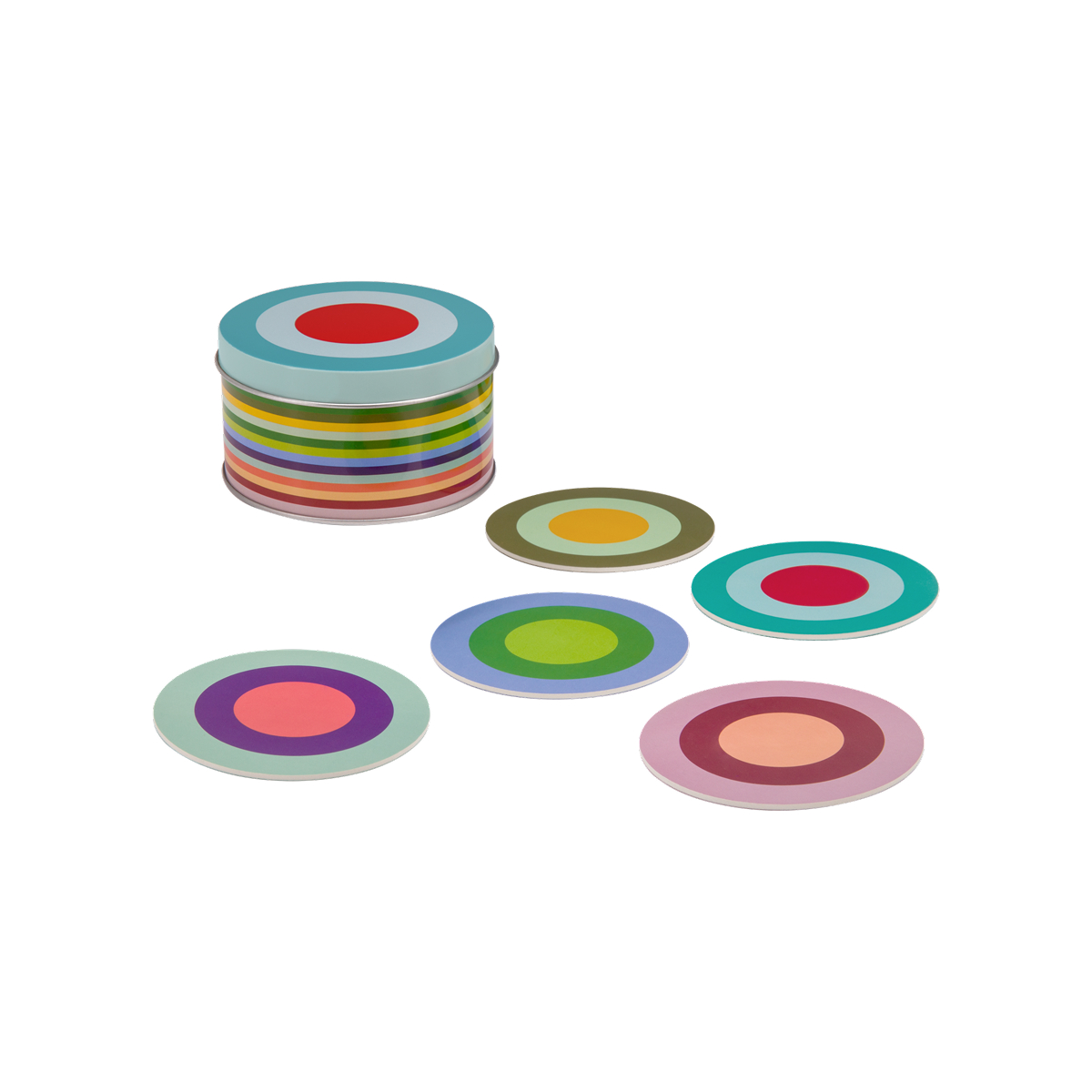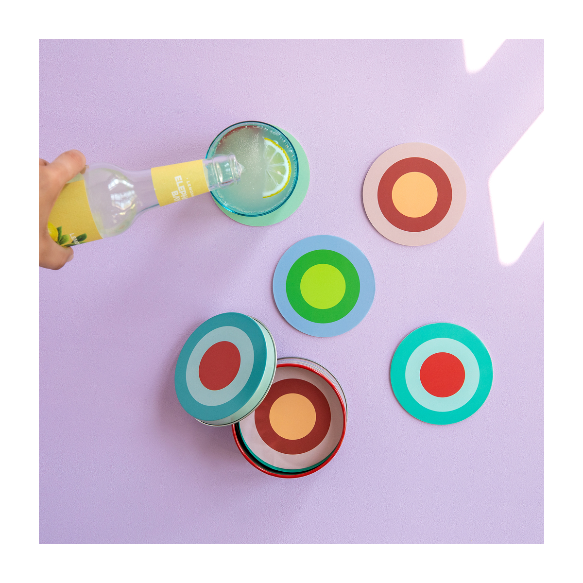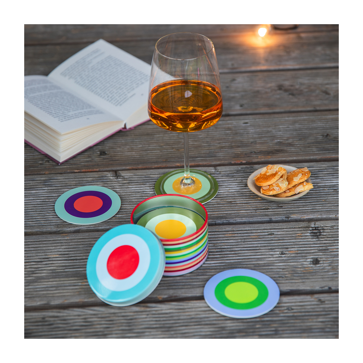 Cardboard coasters with lamination in a tin box, suitable for multiple use, food-safe, Note: store in a dry place, avoid prolonged contact with water or damp surfaces